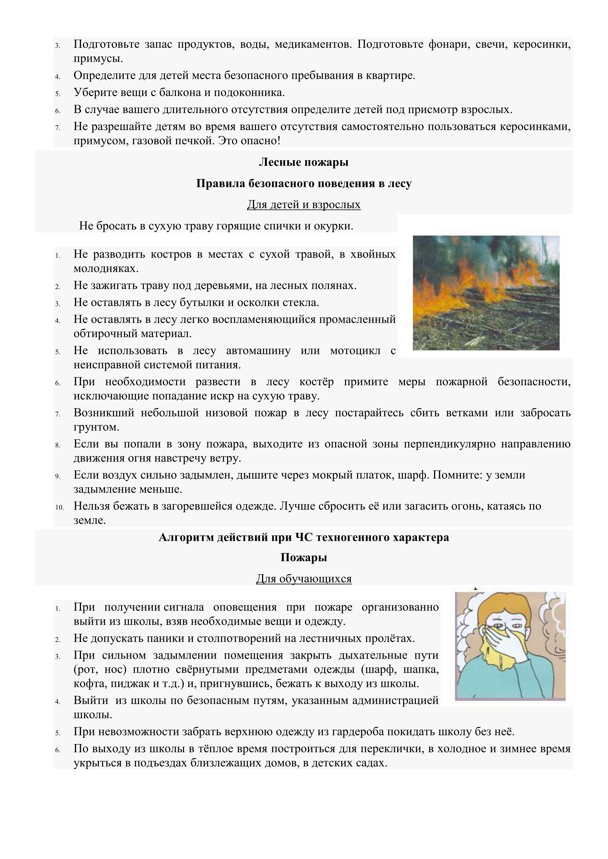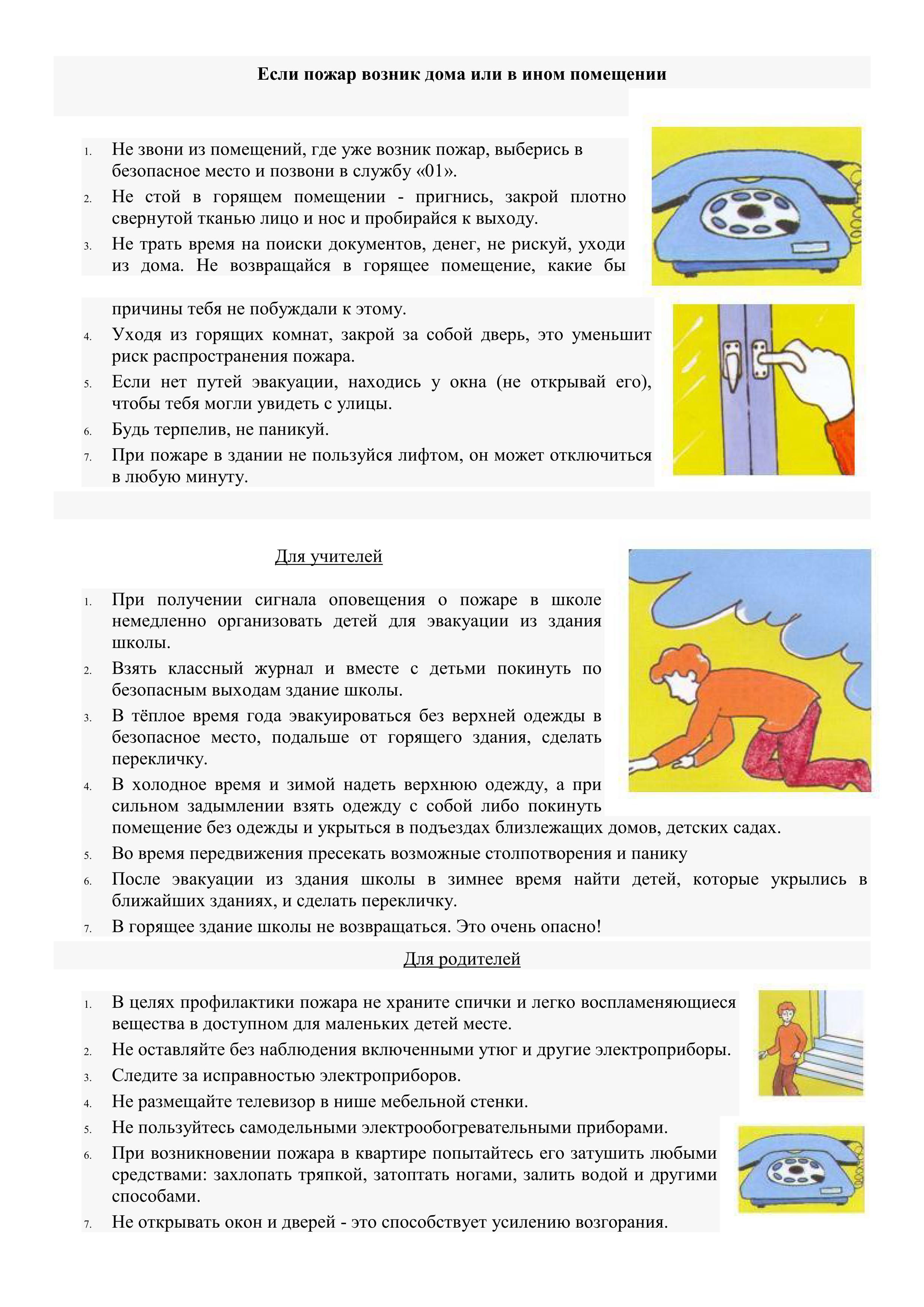 Спички и зажигалки, легковоспламеняющиеся и горючие жидкости, а также лекарства и бытовую химию храните в недоступных для детей местах. Не разрешайте своему ребенку самостоятельно пользоваться газовыми и электрическими приборами. Обязательно расскажите, что нужно делать в случае возникновения пожара. Напомните детям, что при пожаре ни в коем случае нельзя прятаться в укромные места (в шкафы, под кровати), так как это затруднит их поиск и спасение.