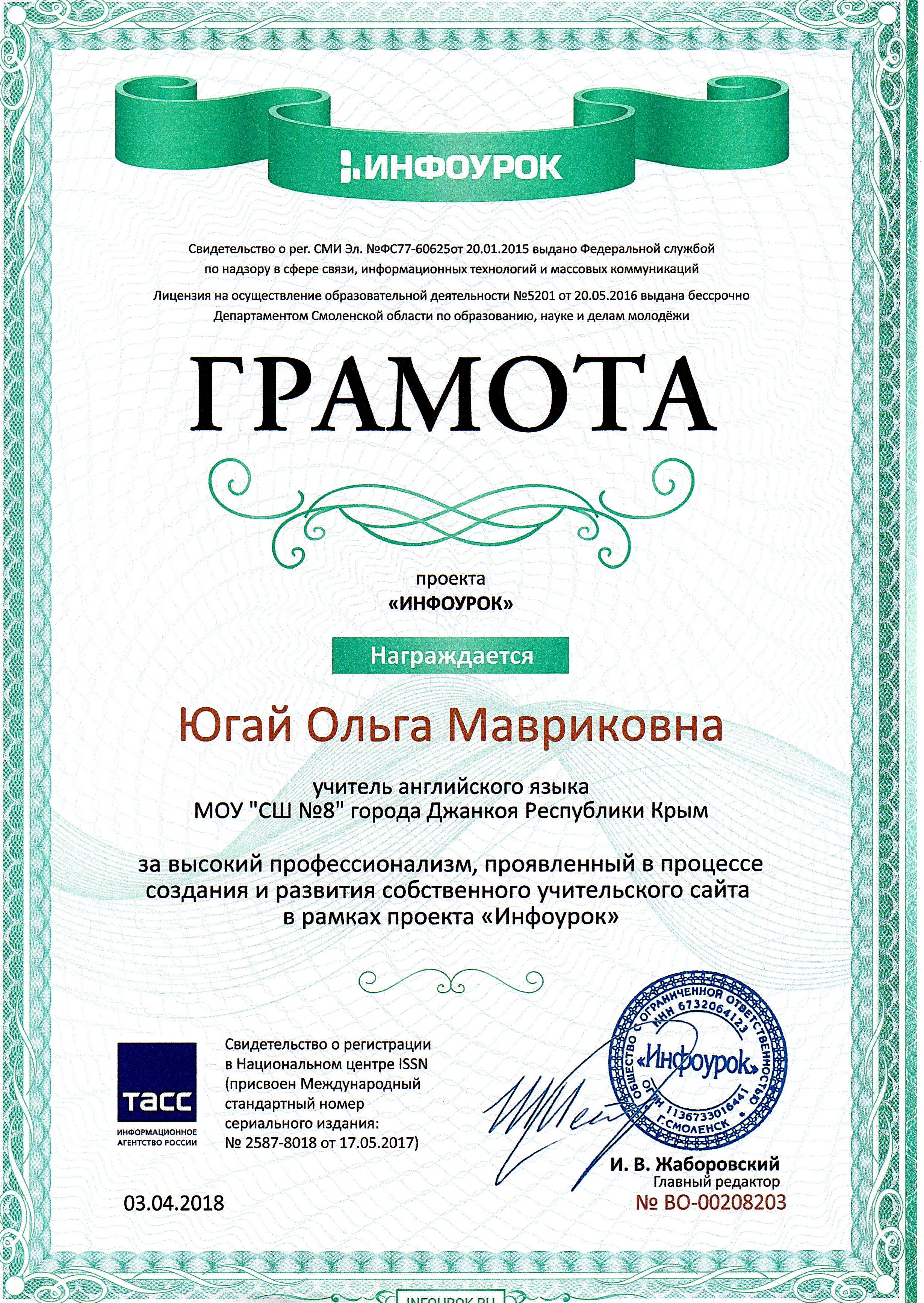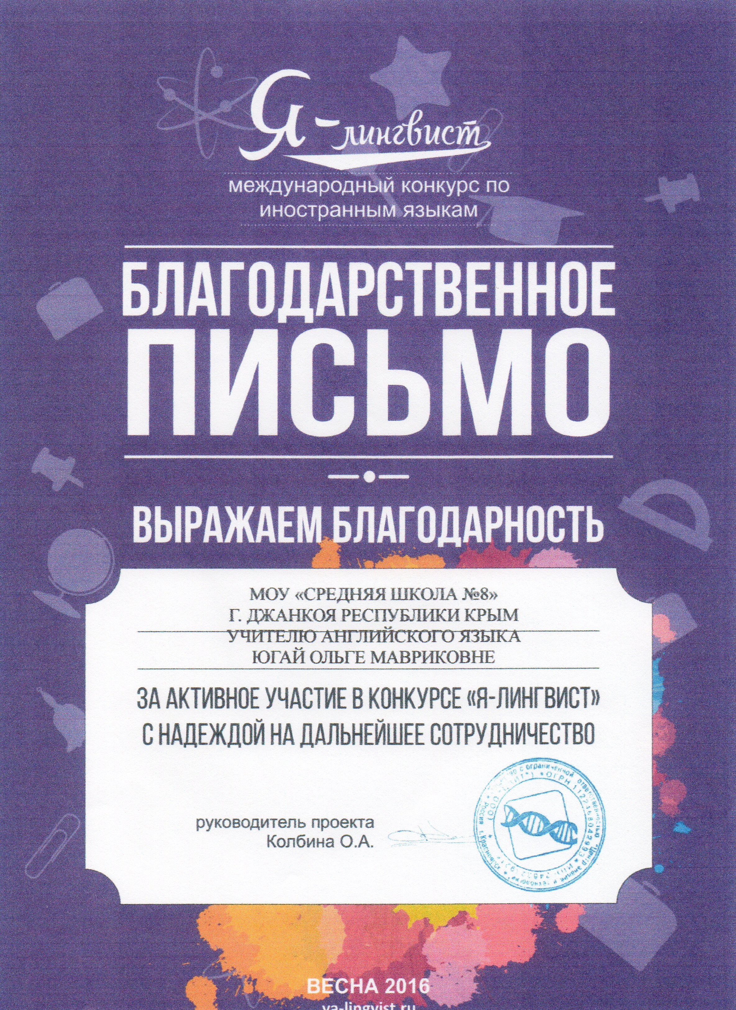 3 | Всероссийский дистанционный конкурс «Оценка уровня квалификации. Учитель английского языка» | 09.10.2016 | Диплом за I место |