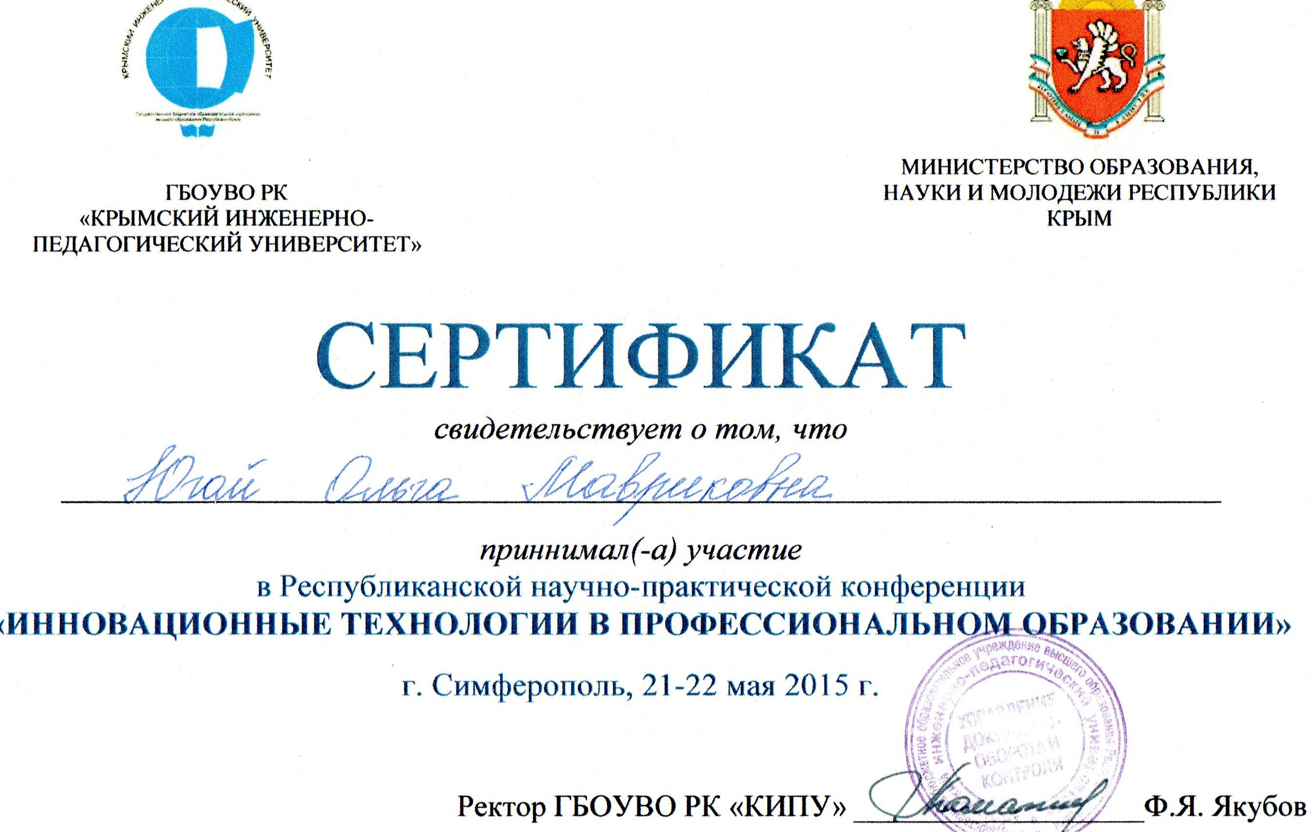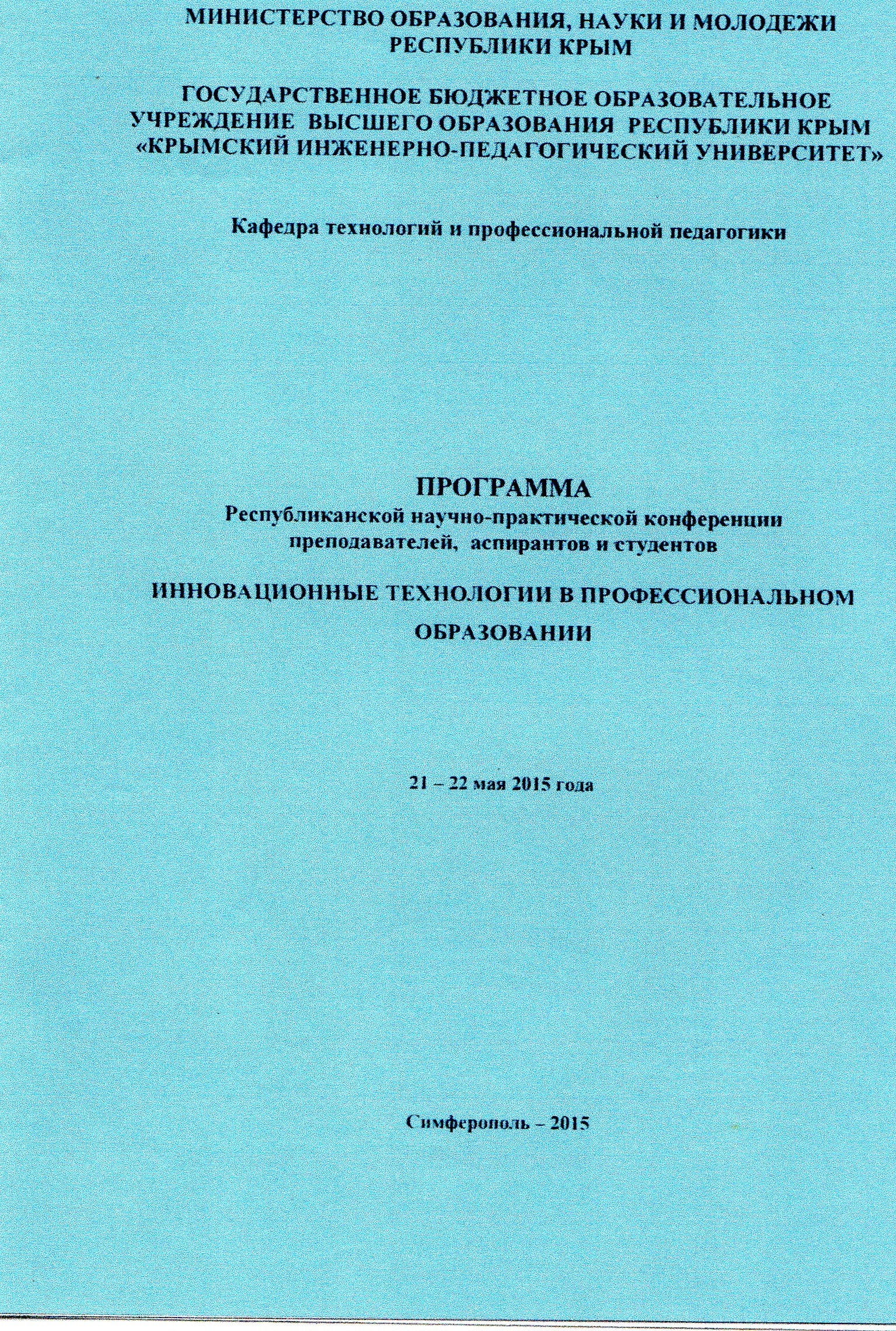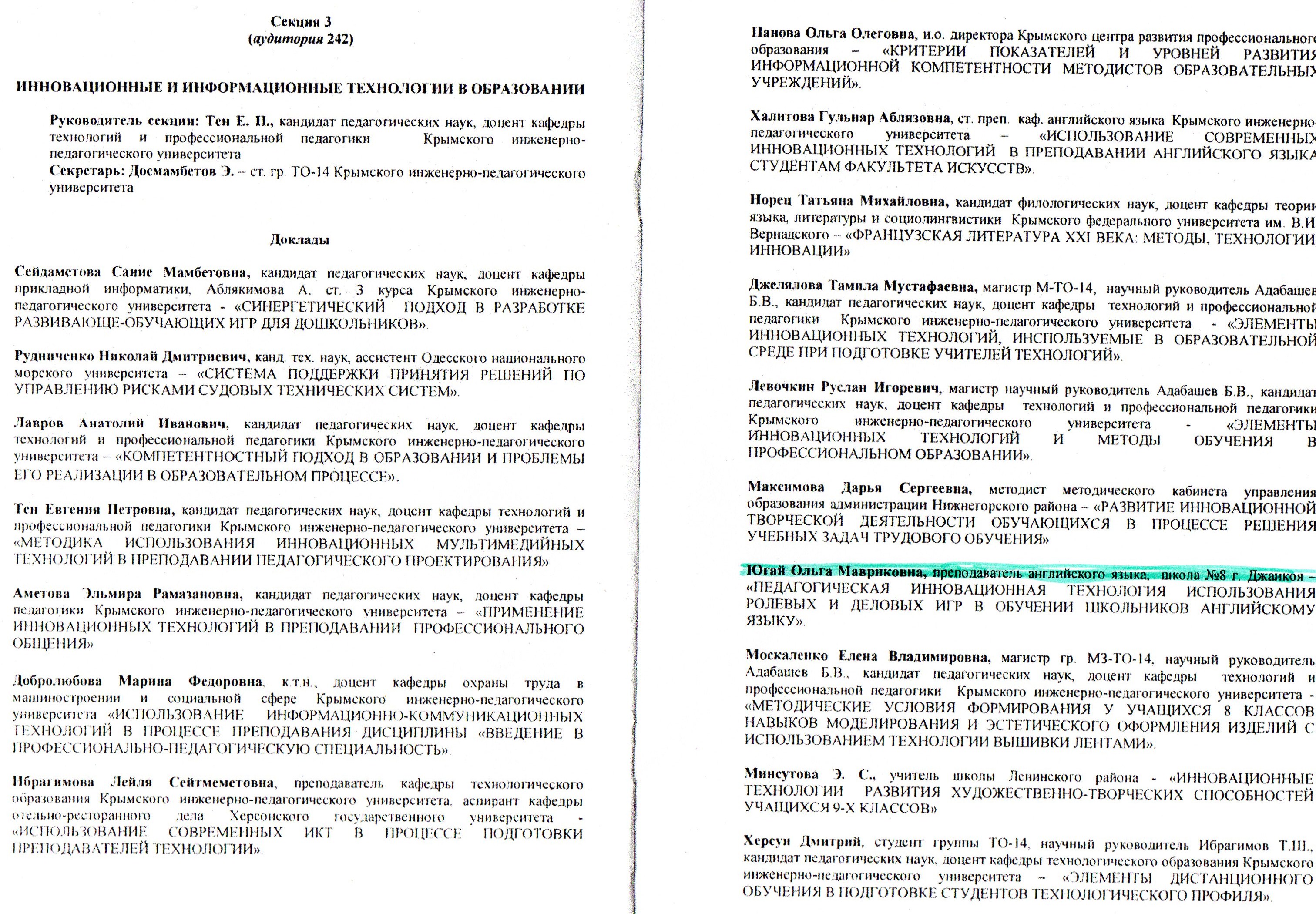 Доклад | Республиканская научно-практическая конференция преподавателей, аспирантов и студентов «ИННОВАЦИОННЫЕ ТЕХНОЛОГИИ В ПРОФЕССИОНАЛЬНОМ ОБРАЗОВАНИИ» (г. Симферополь) | «ПЕДАГОГИЧЕСКАЯ ИННОВАЦИОННАЯ ТЕХНОЛОГИЯ ИСПОЛЬЗОВАНИЯ РОЛЕВЫХ И ДЕЛОВЫХ ИГР В ОБУЧЕНИИ ШКОЛЬНИКОВ АНГЛИЙСКОМУ ЯЗЫКУ» | 21-22 мая 2015 года |