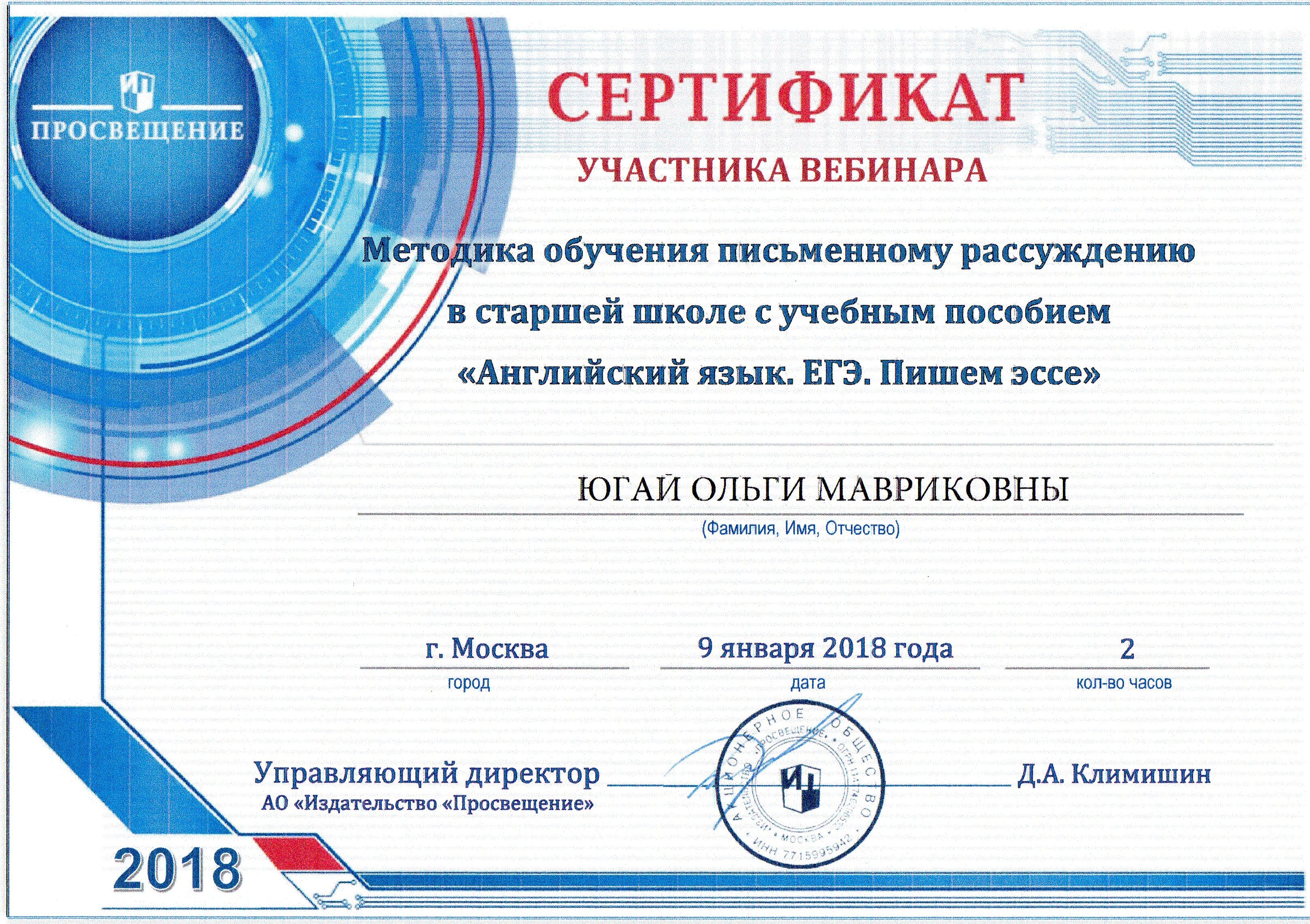 2 | Открытый всероссийский конкурс «Всероссийский шекспировский урок» | 2016 год | Сертификат участника |