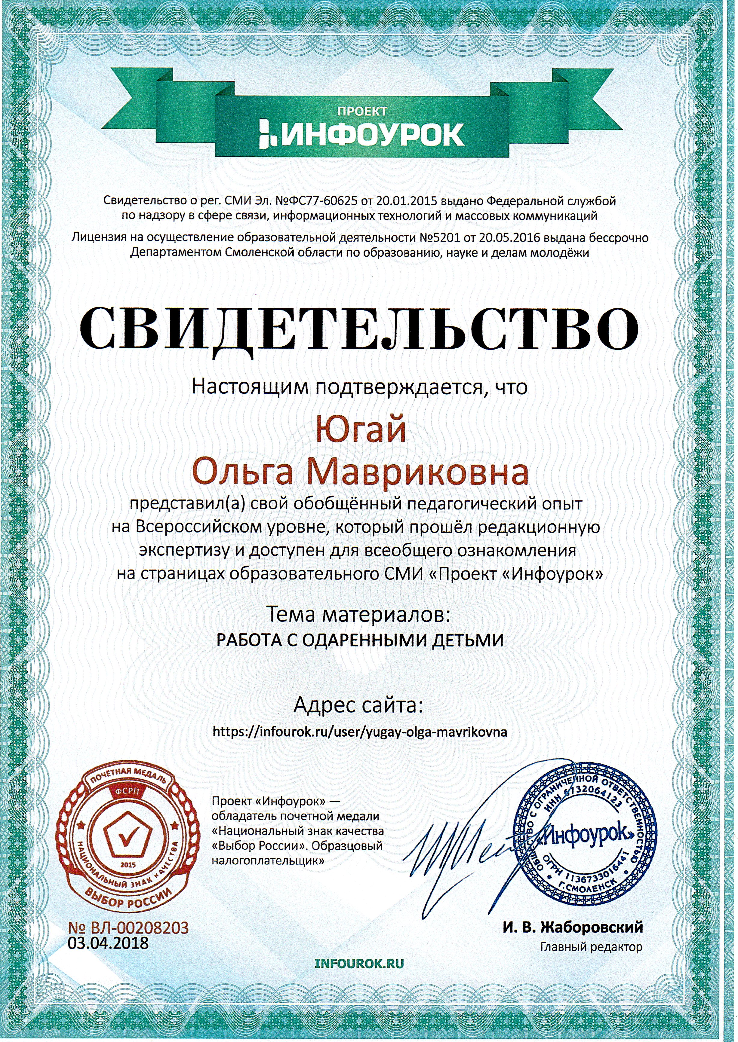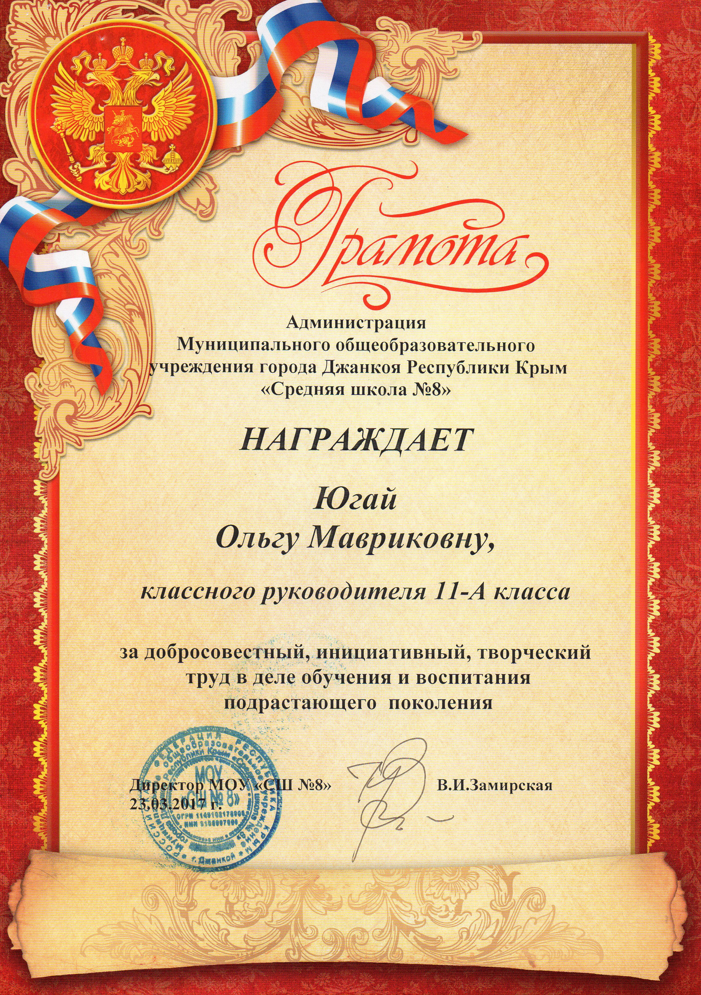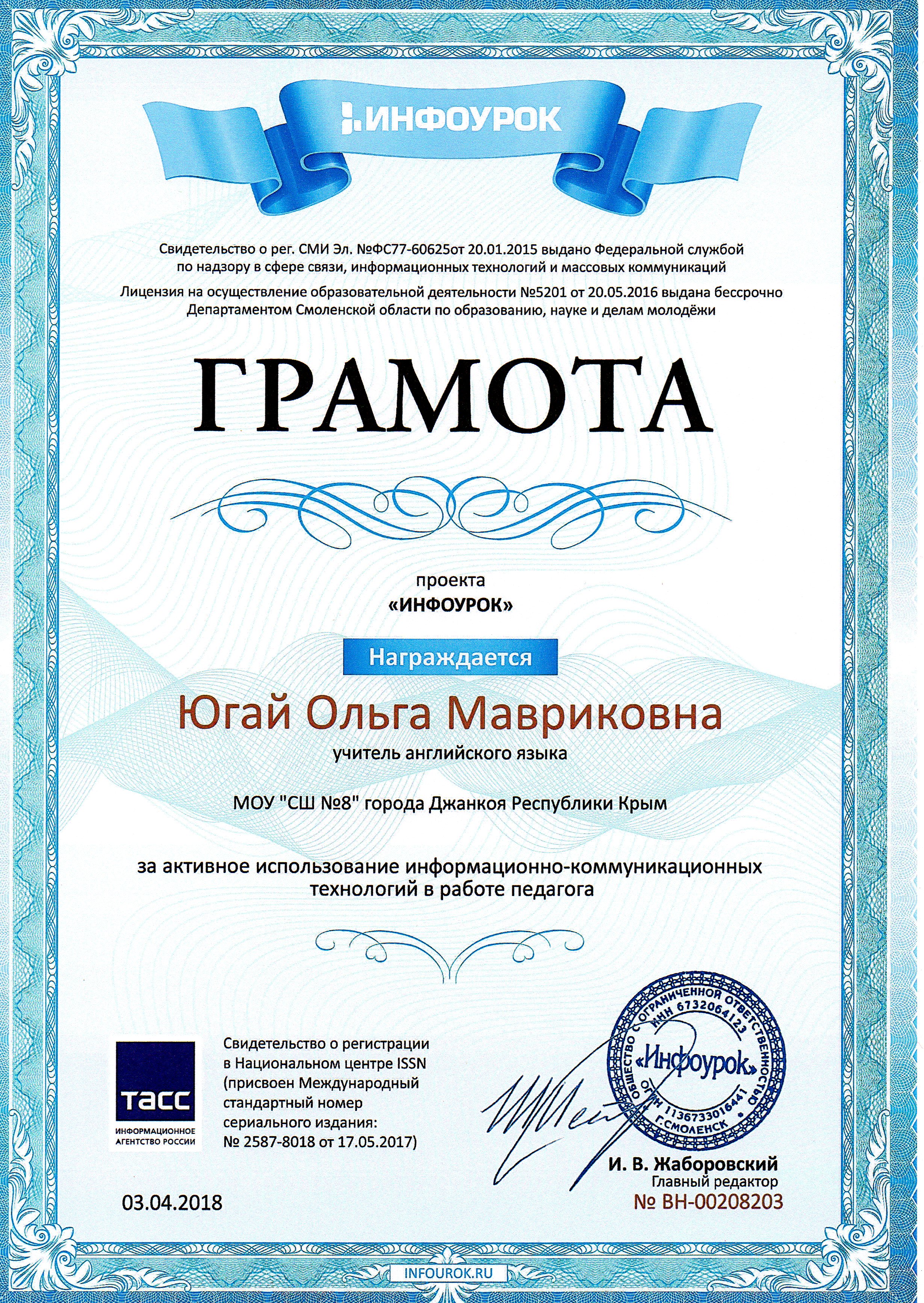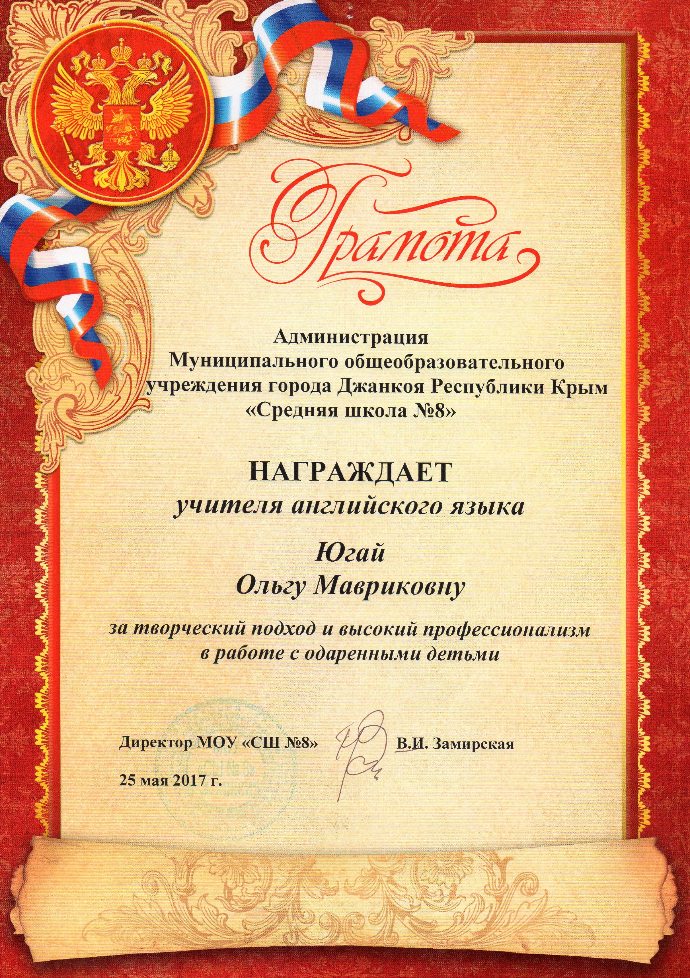 Югай Ольга Мавриковна работает в должности учителя английского языка в МОУ «Средняя школа №8» 20 лет. Имеет высшую квалификационную категорию.
