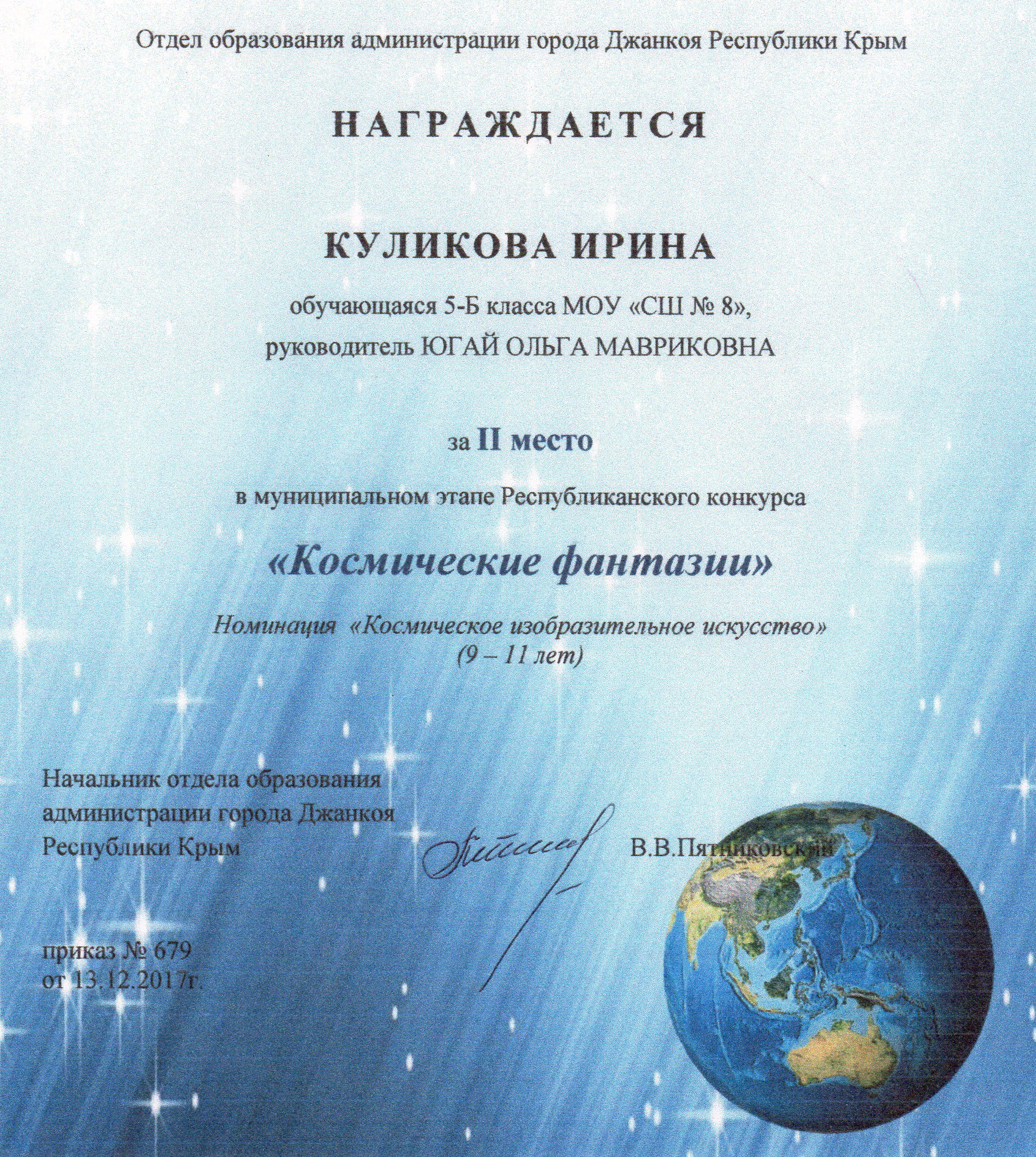 Диплом за I место (Клюев Ярослав-7 класс, Токай Вадим-6 класс), диплом за II место (Черкашина Виктория-6 кл, Левчик Анастасия, Сухоруков Даниил-8 кл, Смирнова Елена-10 кл.), диплом за III место (Онищенко Денис, Лесная Дарья-8 кл, Васильева Мария, Кадыров Аппаз-10 кл), сертификат участника (Киселев Максим, Тюшкевич Егор, Созонов Александр, Миндова Ксения-6 кл, Плинер Максим, Плотникова Дарья, Шевцов Кирилл, Кутузова Дарья-8 кл, Андриевская Кристина, Гафарова Ленара, Сиволап Виктория-10 кл)